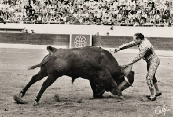 8. Se captó el dinamismo del momento, el torero apoyado en un solo pie, el toro apoya sus pezuñas ligeramente, su musculatura en tensión, agacha la testuz embistiendo a la muleta, y dejando libre el hoyo de las agujas para que se introduzca el estoque.